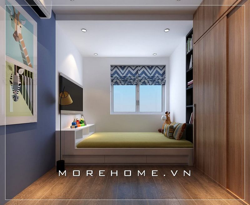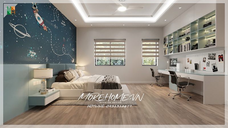 Giường ngủ bé trai hiện đại, tab đầu giường nối liền tạo sự tiện dụng cho không gian thêm ngăn nắp, gọn gàng