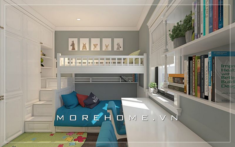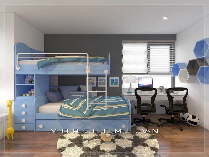 Gợi ý cho bạn mẫu giường tầng gỗ công nghiệp màu xanh ấn tượng cho phòng ngủ 2 bé trai