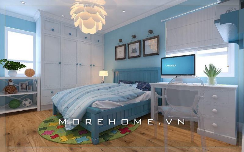 Mẫu thiết kế giường ngủ bằng gỗ công nghiệp cao cấp phun sơn màu xanh dương, tạo cảm giác thư giãn và làm điểm nhấn nổi bật cho không gian phòng ngủ bé