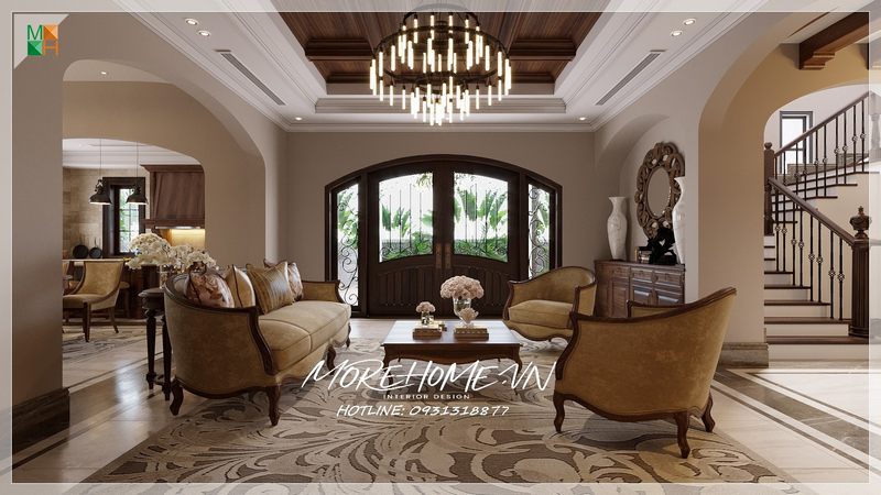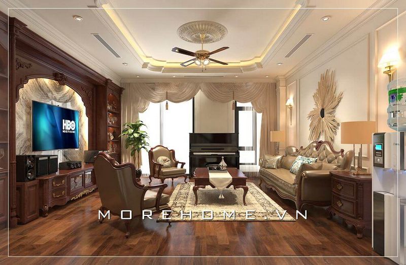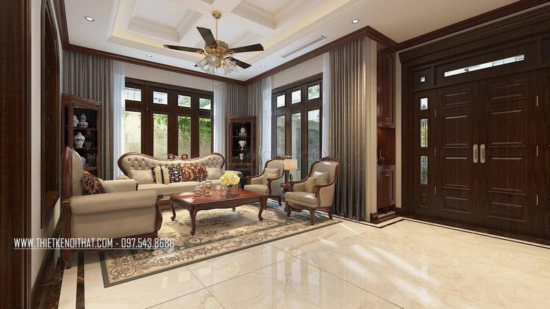 Không gian phòng khách tân cổ điển được thiết kế với đồ nội thất gỗ tự nhiên mang lại vẻ đẹp sang trọng, để lại ấn tượng sâu sắc cho gia chủ