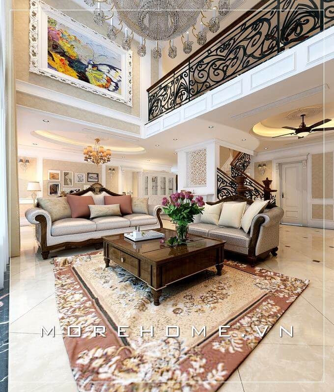 Phòng khách biệt thự, nhà phố thu hút với tâm điểm là thiết kế sofa phong cách tân cổ điển ấm cúng gần gũi với vỏ bọc vải êm ái đầy tinh tế.