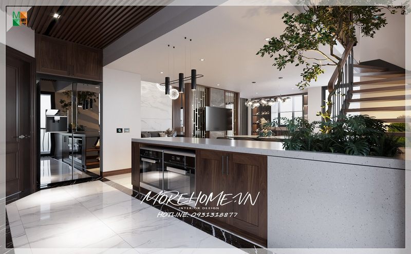 Thiết kế bàn đảo bếp với mặt đá nhân tạo kết hợp với tủ gỗ tự nhiên giúp phân chia khu vực bếp với phòng khách một cách tự nhiên