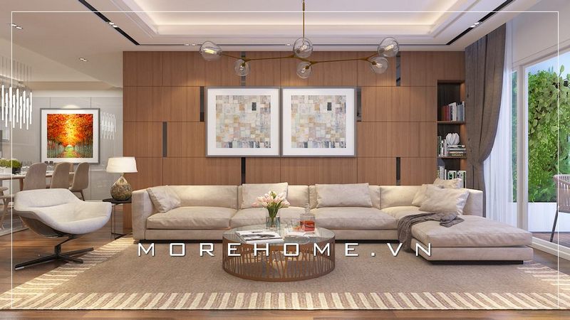 Chiếc đèn thả được treo giữa bộ bàn trà có thiết kế tinh tế và chắc chắn, góp phần tô điểm thêm nét nổi bật cho phòng khách chung cư.