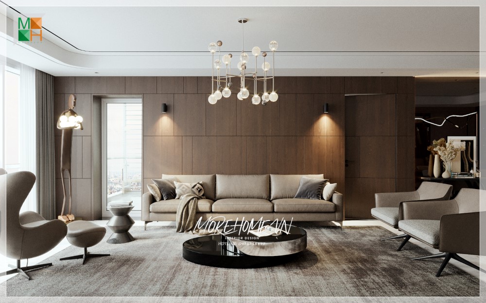 Phòng khách được trang bị bằng nội thất gỗ hiện đại màu xám, tạo nên một không gian ấm cúng và thân thiện cho căn hộ.