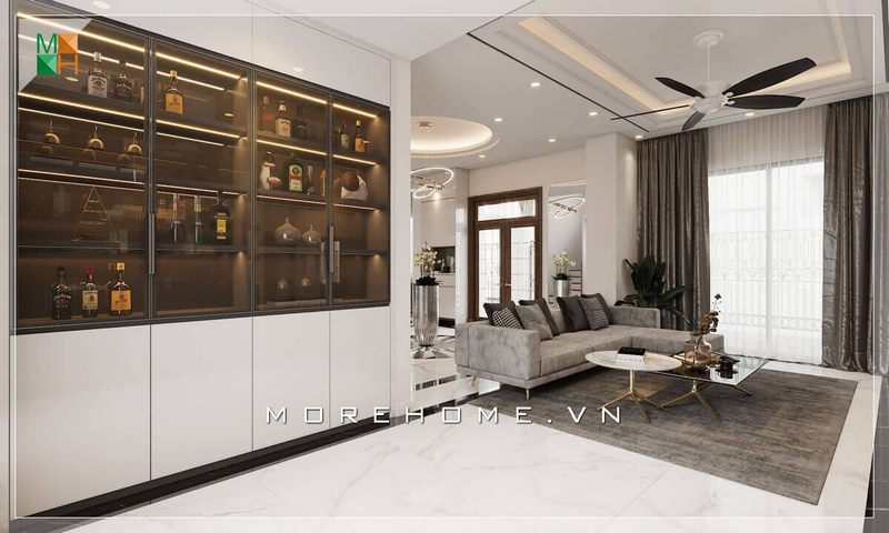 Tủ cánh kính hiện đại có thể để đồ, các ly và chai rượu cao cấp và đẳng cấp, giúp không gian căn nhà trở nên thông minh và sang trọng.
