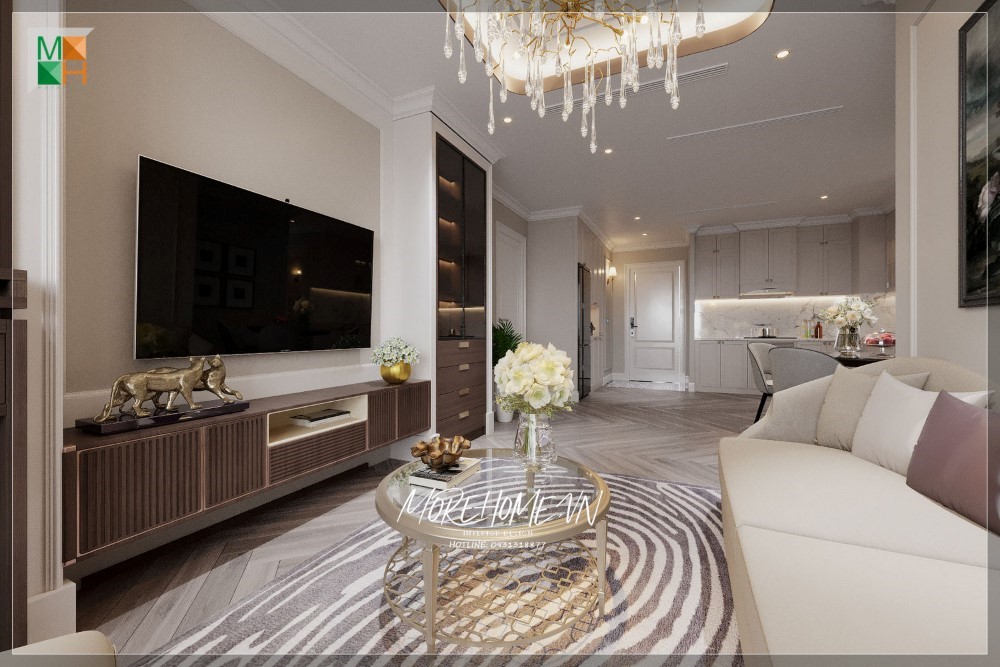 Thiết kế nội thất phòng khách chung cư cao cấp phong cách tân cổ điển sang trọng với từng đường nét, họa tiết vô cùng độc đáo