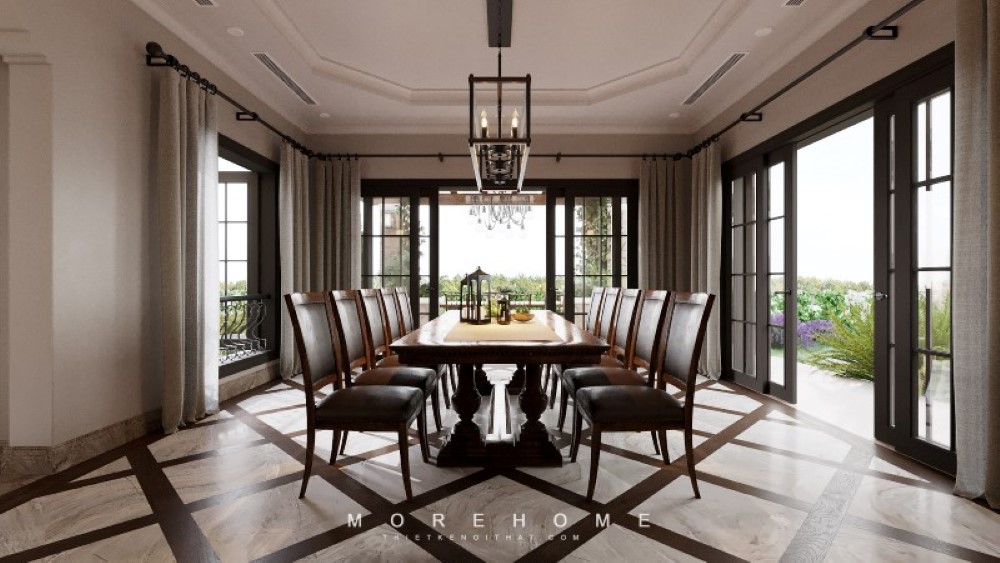 Phòng ăn với phong cách địa trung hải nội thất trang trí màu sắc và chất liệu hài hòa mang tới một không gian tiện nghi và ấn tượng cao về tính thẩm mỹ