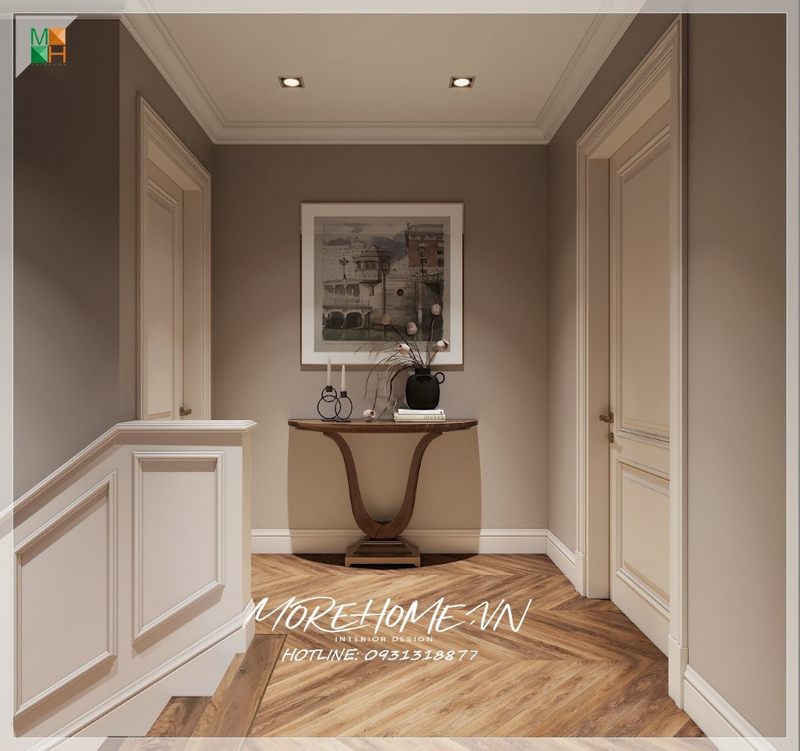 Mẫu bàn console kiểu dáng tân cổ điển sang trọng bằng gỗ óc chó vừa giúp lấp đầy khoảng trống hành lang vừa có thể để bày trí những món đồ decor nghệ thuật ấn tượng