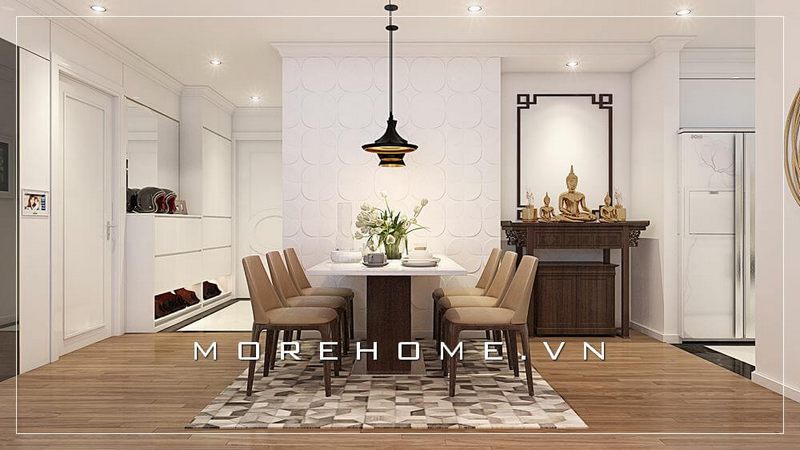 KTS đã khéo léo sắp đặt không gian thờ cúng bằng bộ bàn thờ gỗ tự nhiên và bên cạnh đó là bộ bàn ăn hiện đại nhỏ gọn giúp tiết kiệm diện tích mà vẫn mang lại sự sang trọng.