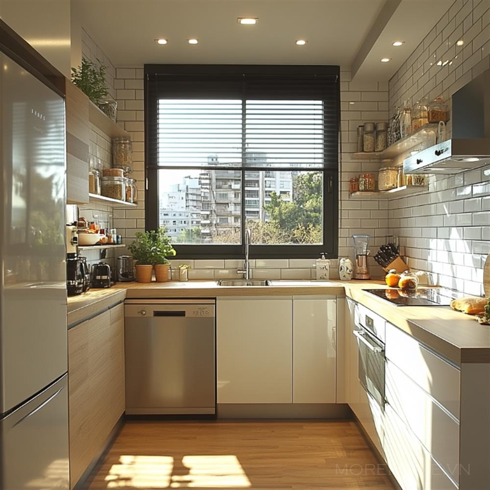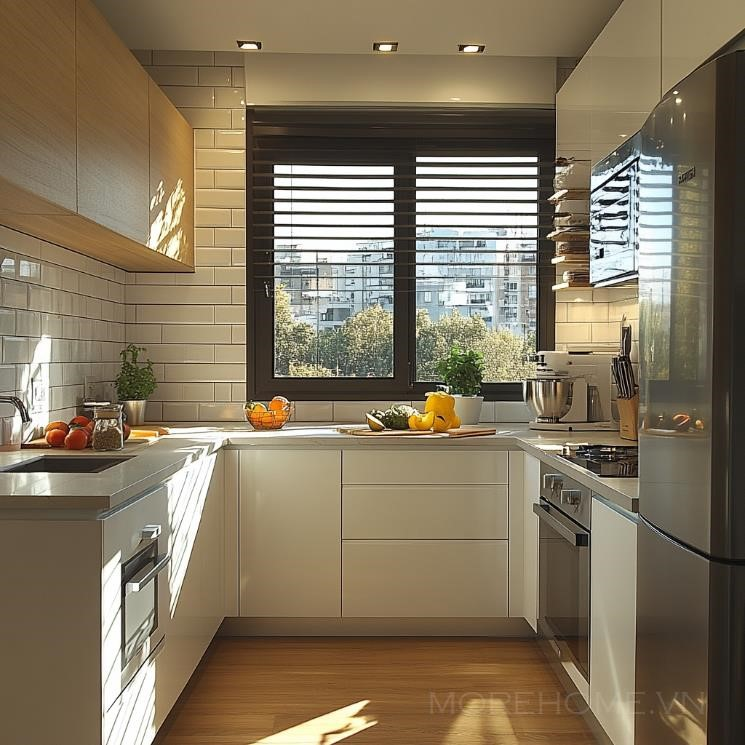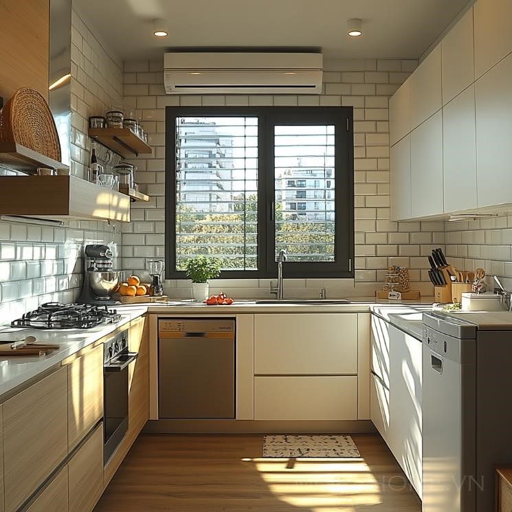 Dự án bếp, rộng 2 mét, dài 3 mét, có cửa sổ, kiểu độc lập, tủ lạnh, máy rửa chén.